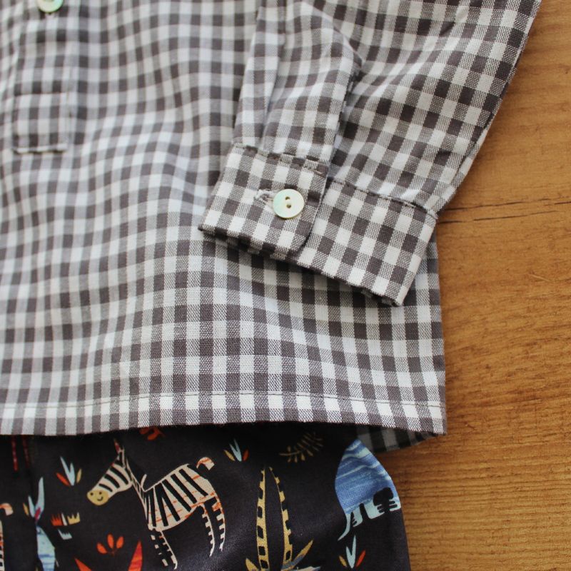 La camisa de cuadro vichy gris antracita tiene cuello mao y 2 ó 3 botones delanteros de nácar y manga larga rematada en puño con botón. Composición 100% algodón.