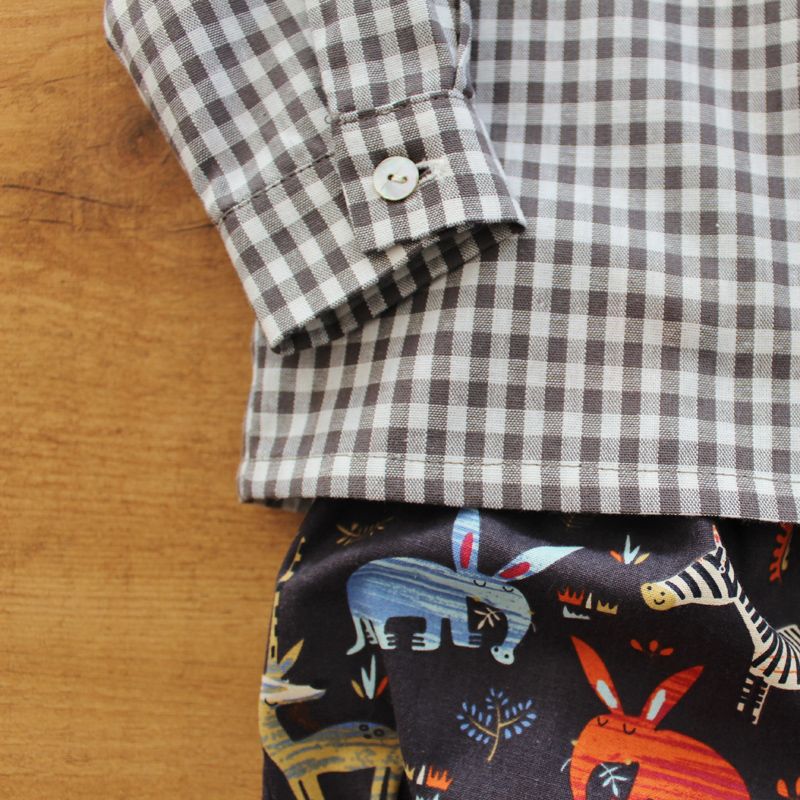 Conjunto de camisa cuello mao en cuadro vichy gris antracita y bombacho en estampado de animales.