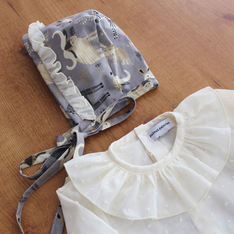 Esta coqueta capota clásica está confeccionada en el estampado Nebraska gris y la adorna un volantito de plumeti color arena. Composición 100% algodón.