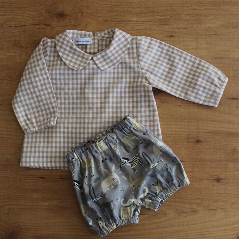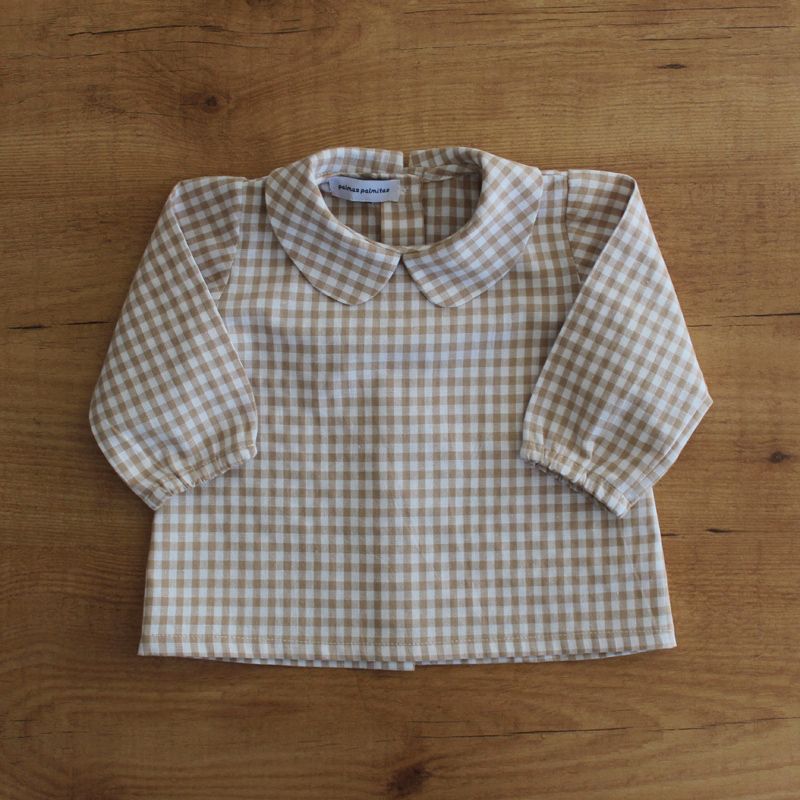 La camisa unisex de cuadro vichy beige Nebraska tiene cuello bebé y botonadura trasera con botones de nácar. Composición 100% algodón.