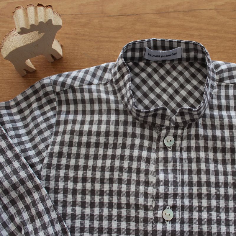 La camisa de cuadro vichy gris antracita tiene cuello mao y 2 ó 3 botones delanteros de nácar y manga larga rematada en puño con botón. Composición 100% algodón.