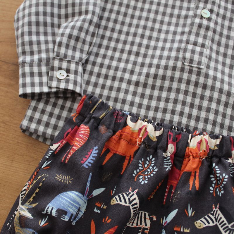 Conjunto de camisa cuello mao en cuadro vichy gris antracita y bombacho en estampado de animales.