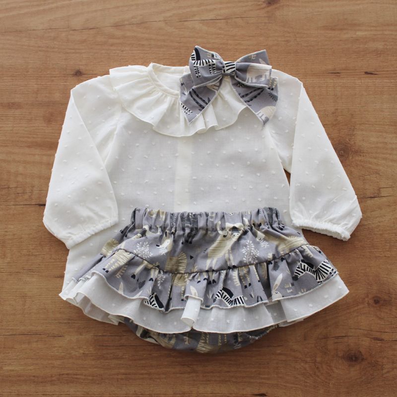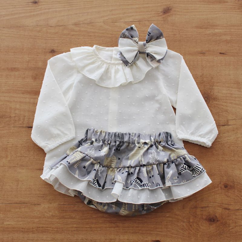 Conjunto de camisa de plumeti arena y culotte con doble volante en estampado de animales gris.
