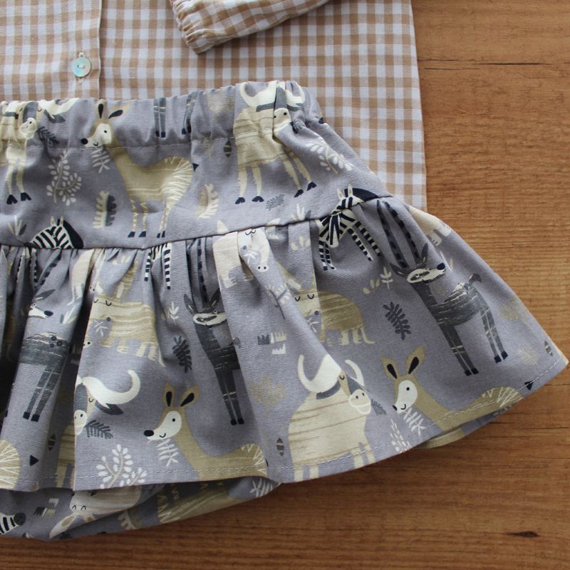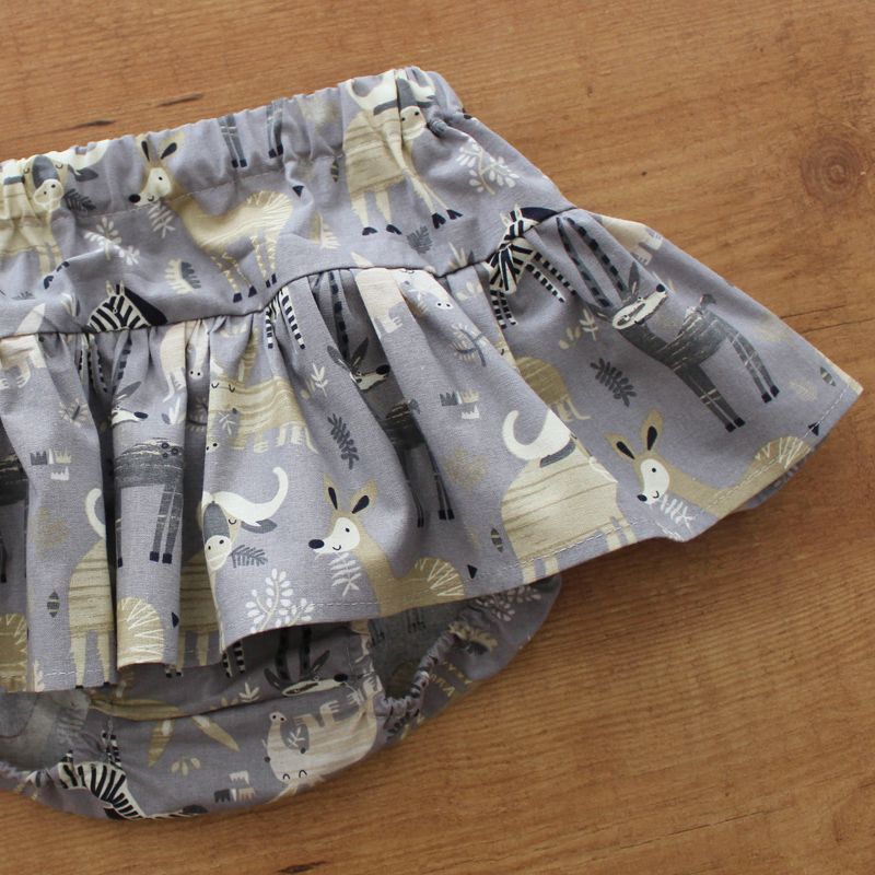 Este culetín está confeccionado en el precioso estampado de animales Nebraska en tonos gris, beige y cebra. Tiene un volante del mismo tejido. Su cintura lleva goma interior ajustable. Composición 100% algodón.