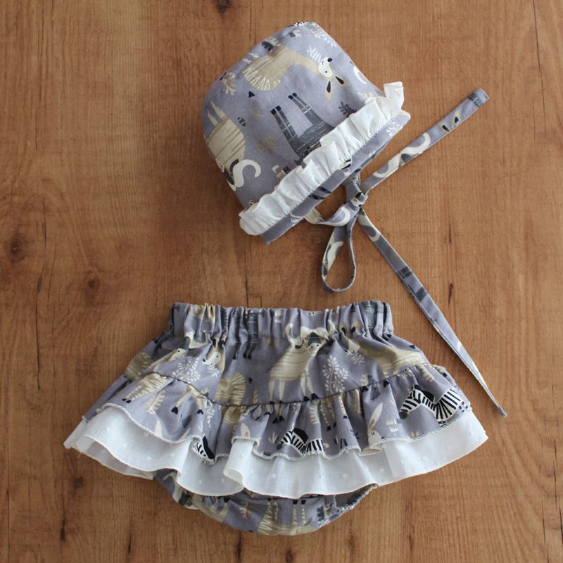 Capota clásica en estampado de animales gris con volantito en plumeti arena.