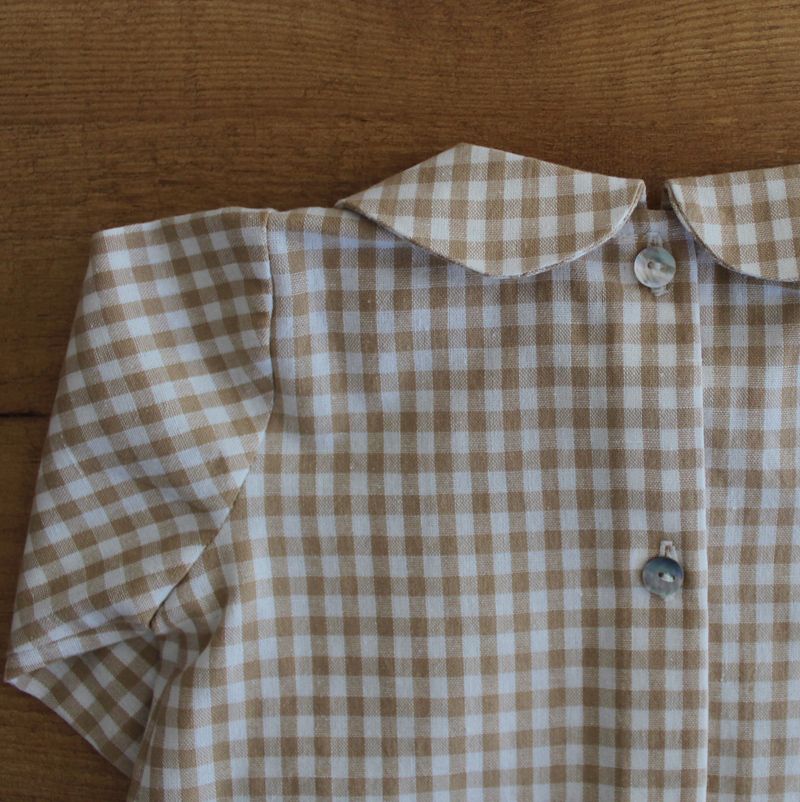 La camisa unisex de cuadro vichy beige Nebraska tiene cuello bebé y botonadura trasera con botones de nácar. Composición 100% algodón.