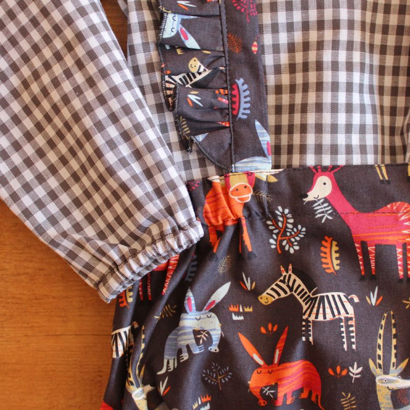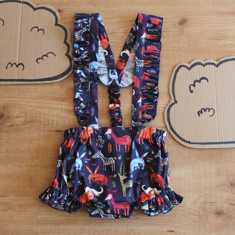 El culetín de niña con tirantes Dark Nebraska está confeccionado en un alegre estampado de animales en tonos borgoña, ocres, celeste, cebra,... Lleva unos cómodos tirantes regulables con volantito y otros dos volantitos adornan la pierna. La cintura tiene goma interior ajustable. Composición 100% algodón.